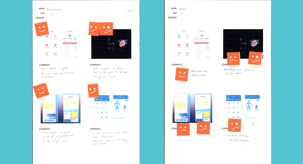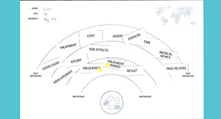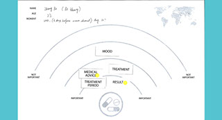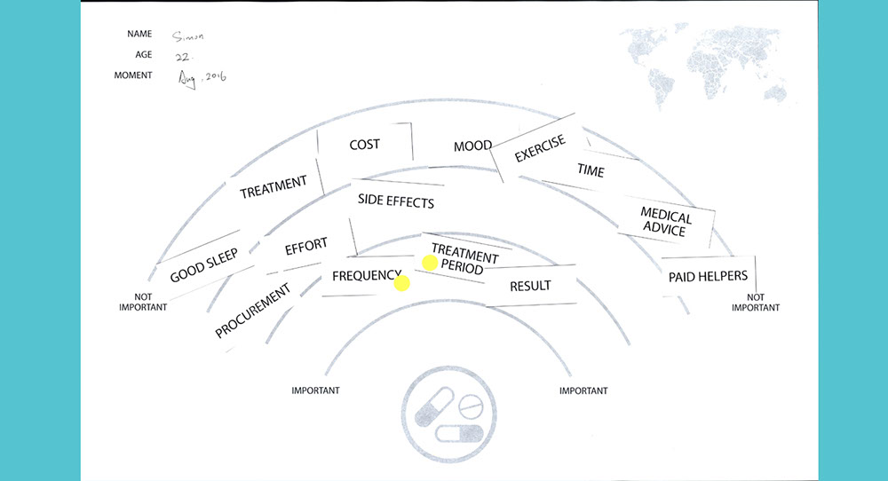 There are two games in the Co Design exercise. Both include a worksheet and supplementary material. Participants are asked to think of a medical moment in their lives and relate that experience to these exercises. Part one consists of a radar map worksheet split into three zones, and some printed words. Participants are asked to place the words within the radar zones according to their feelings related to that word. The aim of game two is to design the function and style of a mobile app that provides you with a record of your medical condition and records your compliance statistics. Participants are first asked to choose an aesthetic that most appeals to them and then select features and buttons that they would expect to be on each screen of the app.