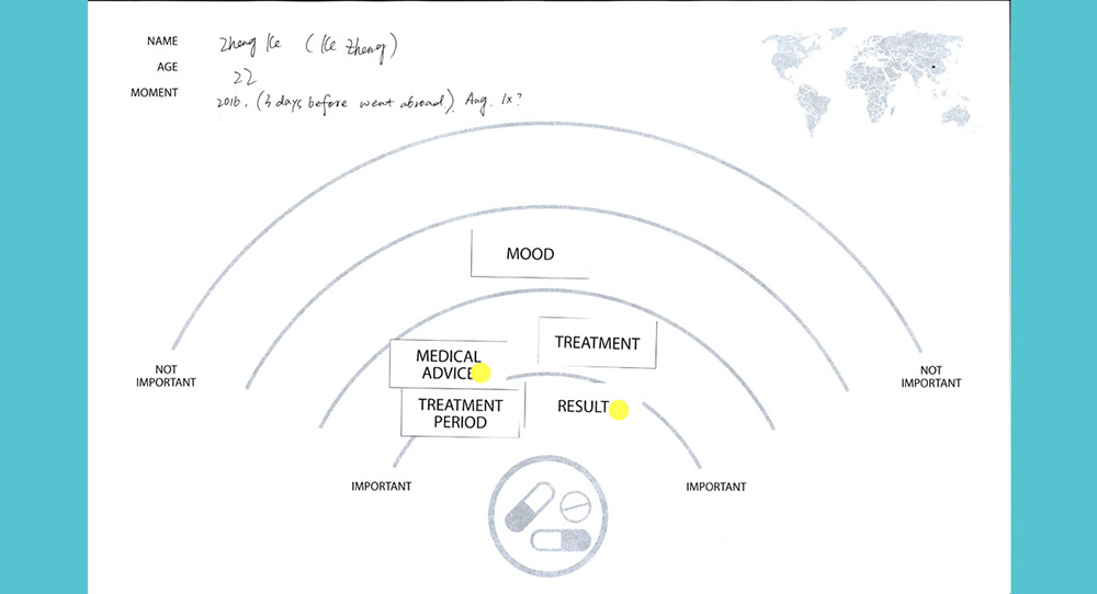 There are two games in the Co Design exercise. Both include a worksheet and supplementary material. Participants are asked to think of a medical moment in their lives and relate that experience to these exercises. Part one consists of a radar map worksheet split into three zones, and some printed words. Participants are asked to place the words within the radar zones according to their feelings related to that word. The aim of game two is to design the function and style of a mobile app that provides you with a record of your medical condition and records your compliance statistics. Participants are first asked to choose an aesthetic that most appeals to them and then select features and buttons that they would expect to be on each screen of the app.